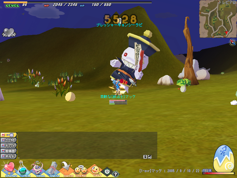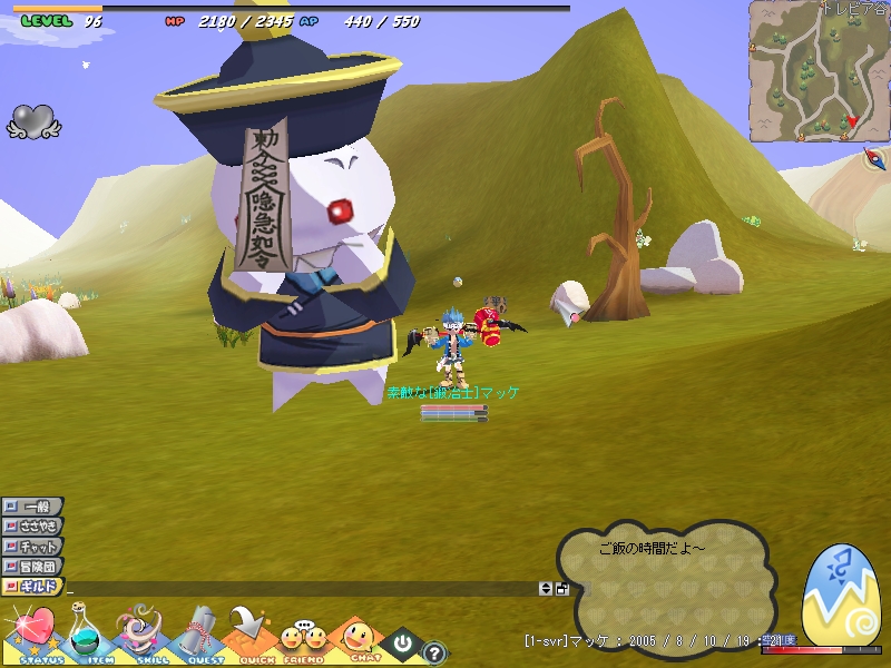 8月13日(土) 最近はシールで期間限定のプレッシャーキョンシーという ウサギさんと遊ぶのが日課になっています。 で、昨日も友達とウサギさんを叩いていたら靴がぽろっと出ました。 友達が拾ったそれを鑑定してあげると・・・・・。 移動速度が12ついた神OPでした!? ちょうど魔法士育ててるみたいだったし、いいものが出てよかったね♪ ウサギと戯れるマッケ その1・その2